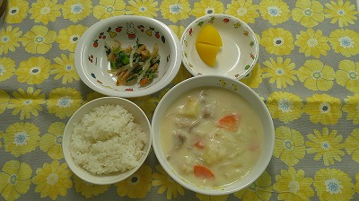 ~今日のお給食~ ・シチュー ・小松菜サラダ ・ごはん ・モモ         ~今日のおやつ~ ・牛乳 ・シュガートースト