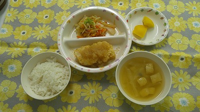 ~今日のお給食~ ・タラのおろし煮 ・白菜のおかか和え ・ごはん ・味噌汁(しめじ・だいこん・油揚げ) ・モモ         ~今日のおやつ~ ・フライドポテト ・牛乳 &nbs…