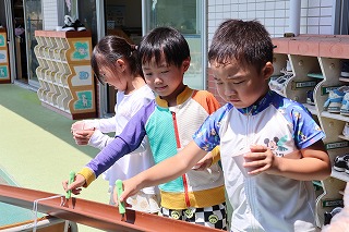 今日は、みんながたのしみにしていた 「スイカ割り」と「流しそうめん」でした。 スイカ割りは、みんなの大声援の中、 「みぎ、みぎ、ちがう。もっとまっすぐ。」と言いながら、 全員で楽しむことができました。 そのあとの「流しそ…