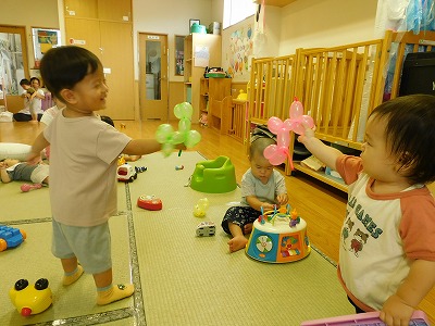 今日はラッコ組とペンギン組のお友達で一緒に過ごしました! お部屋では先生がバルーンアートをし、 犬やお花などいろいろなものを作って見せると とってもニコニコしながら見ていたり、 …