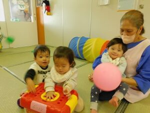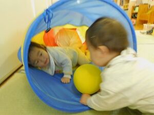 午後は、お部屋の中で風船で遊んだり、トンネルの中に入ったりしました。