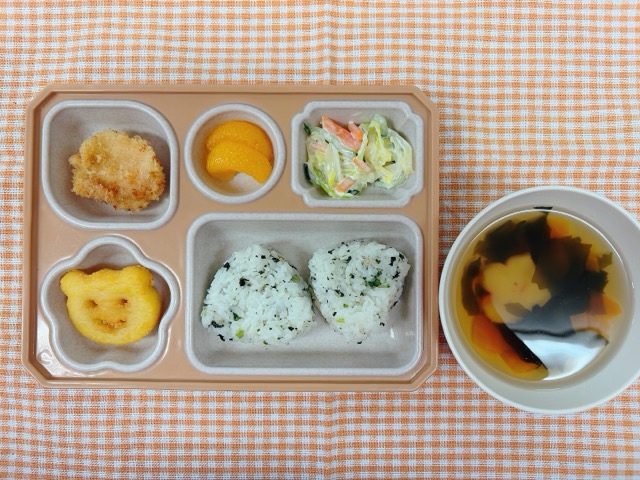4月9日~お花見弁当~ 草加なかよし保育園の給食ブログBy なかよし保育園2026年4月9日 ~今日のお給食~ ・チキンカツ ・スマイルポテト ・コールスローサラダ ・わかめおにぎり ・すまし汁(花麩・わかめ・にんじん) ・みかん ~今日のおや…