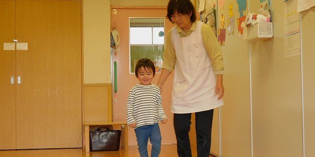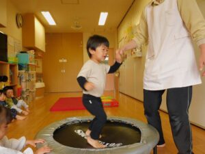トランポリンが大好きで、先生と手を繋ぎながら元気にジャンプをしています。