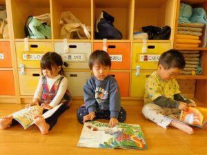 たくさん体を動かしたので、水分をしっかりとって、絵本を読みながら少し休憩タイムをとりました。