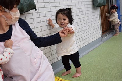 今日はラッコ組はテラスで遊びました シートの上でボールを転がしてみたり、テラスから下の園庭を覗き 幼稚部さんの遊びを見ていたりしていました 保育者と手をつないで楽しそうに歩いていたりしていました 中には一人で歩く練習をし…