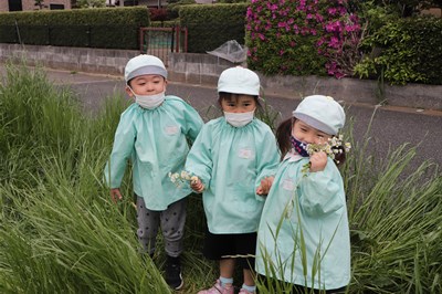 今日のキリン組は、幼稚部さんで「治水緑地」までお散歩に行きました! 治水緑地では坂になっている草のところに子どもたちの興味を示すものがたくさんあります タンポポや春の草花を見つけ、友達と集めることで「花束」を作る姿もあり…