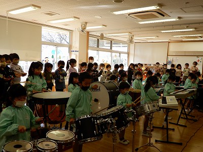 今日は音楽指導を行ない、 幼稚部みんなで「カイト」の 合奏をしました♪ ライオン組はそれぞれの楽器、 キリン組はタンバリン、鈴、トライアングル、 パンダ組はカスタネ…