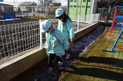 今日は幼稚部、保育部のお友達みんなで 園庭で遊びました♪ 園庭の端のほうに 霜柱ができているのを発見!! 触ってみると「硬い!」「冷たい!」などと 驚いた様子でした…