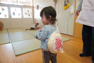 今日ラッコ組のお友達は、 昨日お餅つき会で作った一升餅を これからの健やかな成長を祈り 背負いました! 一升には「一生」の意味がかかっており、 おめでたいお餅とあわせることで 「一生食べ物に困らないように」…