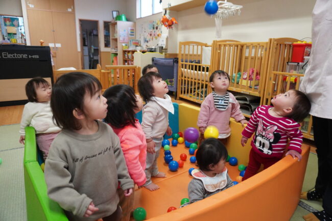今日ラッコ組のお友達は、お部屋でボールプールをして遊びました! ボールをみんなでカゴに集めて先生が上から「ジャー!」と落とすと 子ども達は声を出し、笑っていました♪ …