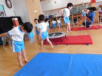 今日は体操指導を行ない、 パンダ組のお友達も 元気に参加しました♪ 鉄棒での前まわりや トランポリン、 前転を行ないました☆  …