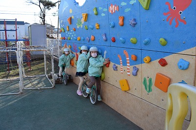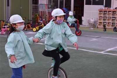ライオン組のお友達は夕方、 園庭に出て遊びました! 一輪車ができるようにと 外に出ると毎日練習をするライオン組の女の子♪ 以前よりも長い距離漕げるよう…