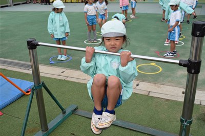 キリン組のお友達の体操の様子を 覗いてみましょう!! しっかりと準備体操をして始めは鉄棒に 脚をつけずにぶら下がる練習です! 以前よりも…