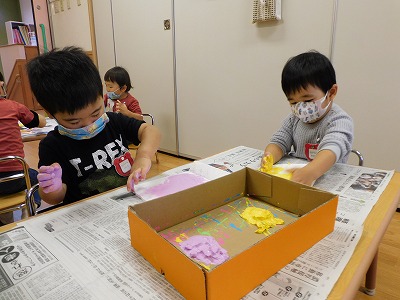 今日イルカ組のお友達はハロウィンの カバンを制作しました! 絵の具を準備し、机に置くと 「なに色にしようかな~?」 「この色にしよう!!」と始める前から わくわくしている様子でした。 指に絵の…