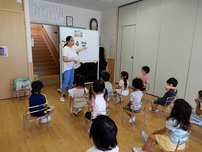 今日キリン組のお友達は、英語指導がありました☆ 動物の名前や天気などの名前を英語で言えるよう 教えてもらいました♪ 上手に座って参加することができました! &nbs…