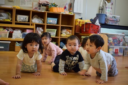 今日ペンギン組のお友達はお部屋の中で リズムをしてたくさん体を動かしました♪ 曲に合わせてハイハイしたり 床に寝てゴロゴロ転がったりと 上手に体を動かすことができて…