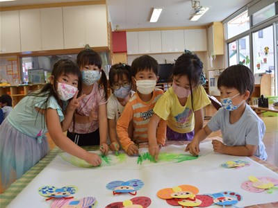 今日は幼稚部のお友だちは制作を行いました。 一体何を作っているのでしょう? 材料は花紙、画用紙、クレヨン、丸シールです! 次はみんなで模…
