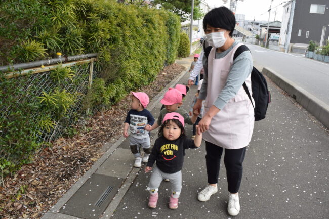 ラッコ組さんは、辰井川沿いをお散歩しました(*^^)v 靴を自分たちで持ってきてお散歩へ行く準備をしています! 先生やお友達と上手に手を繋いで歩いています☆ 歩ける…