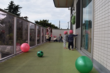 今日ラッコ組のお友達は テラスで外気浴を楽しみました! みんなでボールをポーンッと投げたり 園庭で遊んでいるお友達に手を振ったりじっとながめたりして …