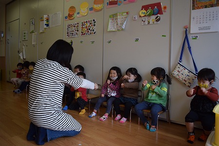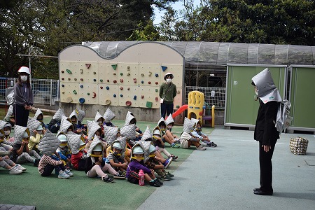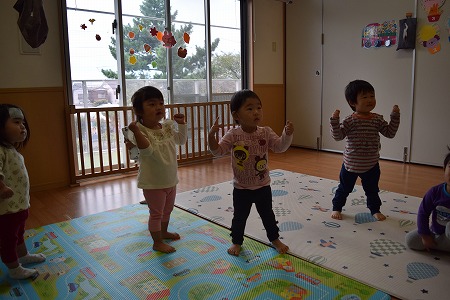 今日イルカ組のお友達は 英語教室に参加しました! お名前を呼ばれると上手に「here!」と お返事していました♪ ハロウィンの絵本を見ると 「おばけだ…