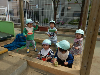 今日は園庭で遊びました★ 三輪車に乗って園庭中を走り回ったり、 ショベルカーやシャベルでお砂を掘ったり、 型に入れてケーキを作ったりして…