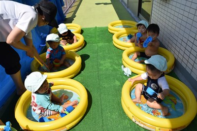 今日ペンギン組のお友達は 午前中水遊びを行いました(^^)/ お友達や先生と水を掛け合ったり おもちゃで遊んだり楽しそうにしていました♪ たくさん遊んだ後は給食の時間です♪ &n…