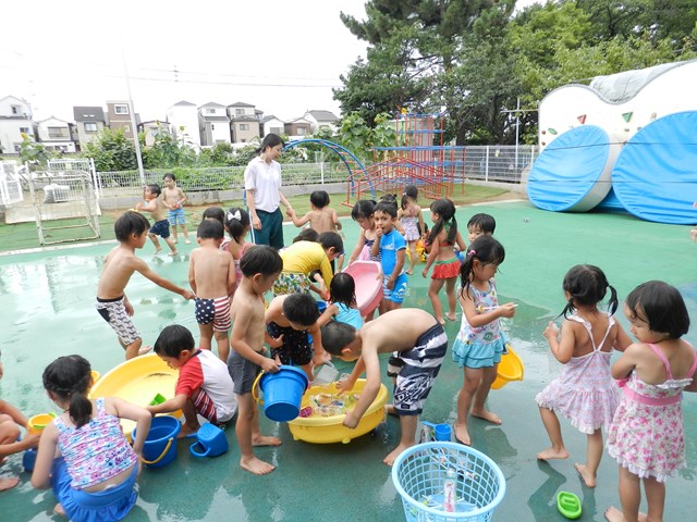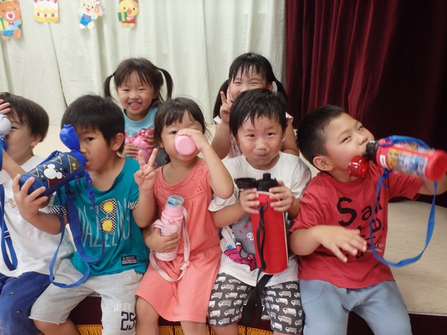 本日はパンダ組は水遊びをしました。 みんなで作った水鉄砲やバケツで 水の掛け合いを楽しんでいました。 水遊びでたくさん遊んだ後はお腹がペコペコで 大好きなから揚げを美味しそうに食べていました。