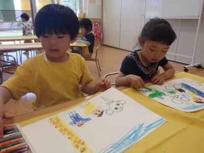 今日キリン組のお友達は昨日の親子遠足の印象画を 描きました♪ お友達同士「ぞうさんがいたよね」「キリンさんもみたよ」などと お話しながらとても楽しそうに描いていました(*^_^*)  …