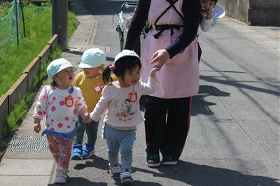 今日ペンギン組のお友達は お散歩に行きました。 園の周りをぐるーっと歩きました! 園庭にあるこいのぼりを見て「わー!」と声…
