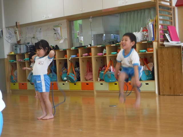 本日は体操教室を行いました。 パンダ組さんは縄跳びに挑戦しました。 まずは先生のやり方を見て跳んでみます。 つづいて一人ずつ見てもらいました。 最後はちょっとしたお遊び。 先生が縄跳びの端を持ってパンダ組さんをいっぺんに…