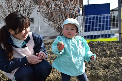 本日はみんなでジャガイモを植えました。 キリン組さんが種イモを2つに切って切り口に灰を付けました。 それを各クラスで植えました。   ラッコ組さんはまだ土を掘れないので 先生の掘った穴に種イモを置いて土をかぶせ…