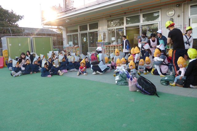 本日は避難訓練を行いました。 ペンギン組さんも防災頭巾をしっかり被って参加しました。 消防署の職員さん立ち合いの通報訓練と消火訓練です。 まずは2階の調乳室から出火と想定しての非難訓練を見てもらいました。 いつもの外階段…