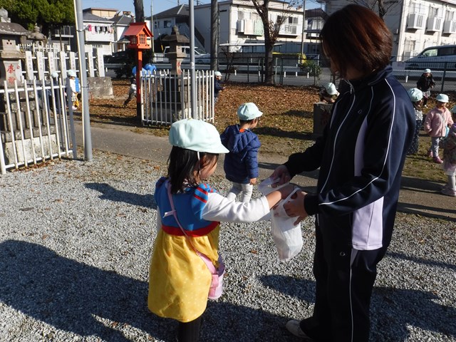 本日幼稚部さんは神社公園にお散歩に行きました。 公園で遊ぶ前に清掃活動としてゴミ拾いをしました。 キリン組さんもガンバって拾いました。 綺麗になった公園でみんなで遊びました。 ドングリも拾いました。 お掃除をして気持ちよ…
