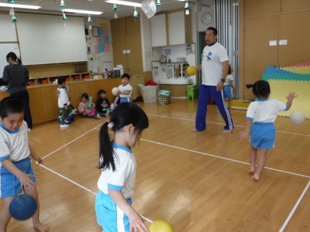 本日は体操教室を行いました。 キリン組さんも張りきって参加しました。 今日はドリブルと逆上がりの練習です。 まずはドリブル、まりつきのようにその場でついてみます。 少しずつ歩く距離を伸ばしてカラーコンを周ってきました。 …