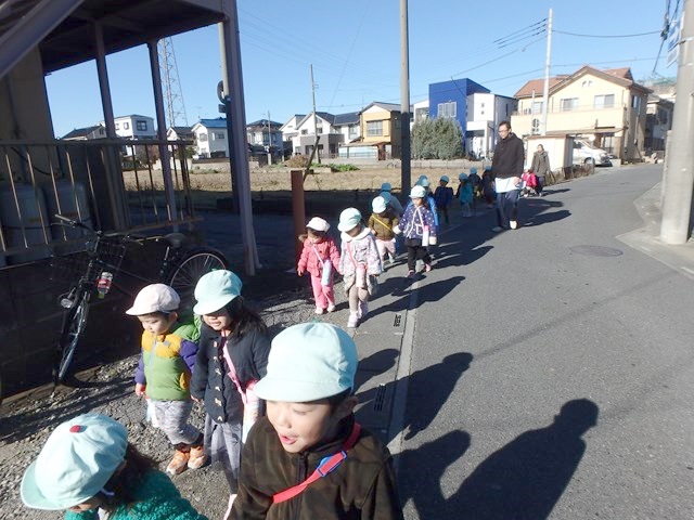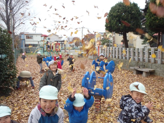 本日ライオン組さんは体操教室のあとイルカ組さんと 神社公園まで遊びに行きました。 今日は落ち葉投げをして遊びました。 境内に積もった銀杏の葉を集めて放り投げます。 紙吹雪のように舞う銀杏の葉が楽しいです(^^) 寒くなっ…