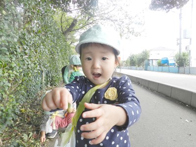 本日ペンギン組さんは園周りのお散歩をしました。 ビニール袋のバックを提げて製作で使うドングリを集めました。 みんな見つけたドングリを見せてくれました。 木の枝や木の葉も欲しくなります(^^) 大量のドングリに大満足のペン…