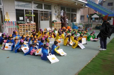 本日はハロウィンです。仮装して外に行きました。 出発前に先生から説明を聞きます。 保護者ボランティアの方も仮装してくれました。 幼稚部さんは桃の木公園まで行きました。 町会のみなさんが待っていてくれました。 「トリック・…