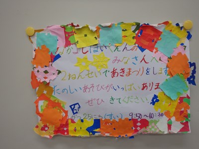本日ライオン組さんは新里小学校のお祭りに行ってきました。 2年生のお兄さんお姉さんから画用紙大の招待状が届きました。 なかよし保育園のほか、近くの3園が招待されて参加しました。 お手製のお神輿もありました。…