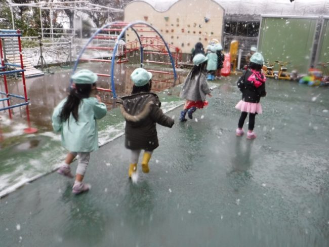 今日は初雪でした!!!子ども達は、朝から大喜び♪ パンダ組さんは、しっかり防寒をして、園庭で雪遊びをしました! パンダ組のお姉さんが、ラッコ組のお友達にも、雪団子を作ってあげました。 冷たいお…