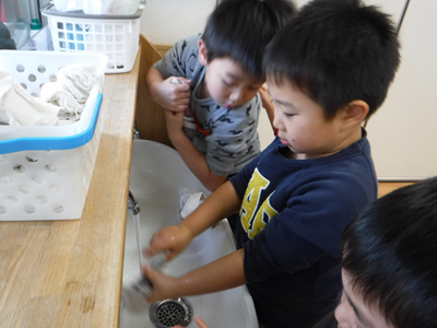 キリン組さんではおやつの後にお掃除をしています。 雑巾を絞って自分の椅子を拭いたり床を拭いたりしています。 雑巾絞りはまだちょっと苦手です。 なかなか先生から合格がもらえません。 どうやったらきちんと絞れる…