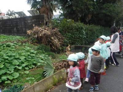全クラスで園の周りをお散歩しました(*^。^*) 大きい子は小さい子と手を繋いでしっかり歩いています♪ 歩いていると木の実を見つけました!  …