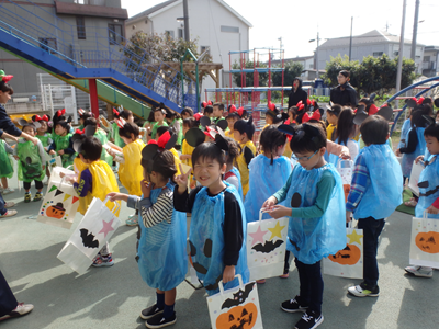 本日は、ハロウィンです。保育部と幼稚部に分かれて外に行きました。 幼稚部さんは桃の木公園へ。ここでは町会の方々が向かてくださいました。 「トリック・オア・トリート」 「ハッピー・ハロウィーン」 公園内数か所に待機している…