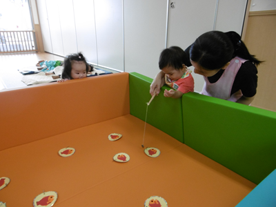 今日はプール納めの日でしたがあいにくな天気のため中止に・・・ なのでらっこ組さんは屋内で魚釣りごっこをしました。 プール納め記念に作ったおさかなメダルに クリップを付けて磁石付の竿で釣ります。 記念撮影♪ 来月の敬老の日…