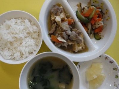 ~今日のお給食~ ・厚揚げのみそ炒め ・きゅうりの昆布和え ・ごはん ・こまつなと豆腐のみそ汁 ・パイン ~今日のおやつ~ ・フライドポテト