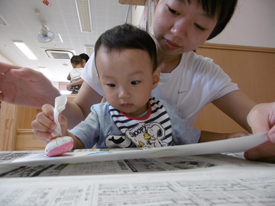 もうすぐお月見♪♪ ということでラッコ組さんはお団子を乗せる 「三宝」の模様を作りました。 タンポに絵の具を付けて色を押し付けます。 最初は何をしているのか分からないようすでしたが 途中から楽しくなってきたようです 天気…