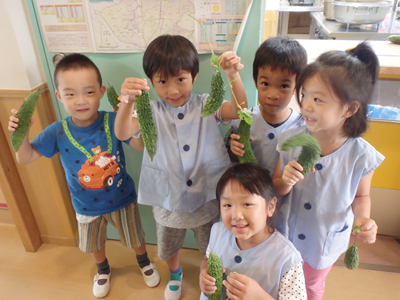 幼稚部では午前中マーチングの練習をおこないました。 来月の本番に向けてガンバっています。 なかよし農園ではまだまだ採れます、ゴーヤ! ゴーヤチップスを作るので切って干しました♪ 園内では毎朝ワンダーランド体…