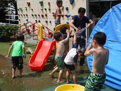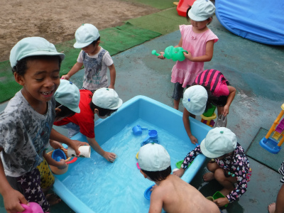 幼稚部さんは先生と約束事を確認した後 園庭で水遊びをしました(^^)/ プールに入っている水をバケツに入れて 先生や実習生にかけて遊んでいました! 先生が子どもたち…
