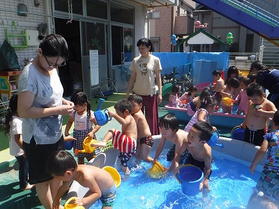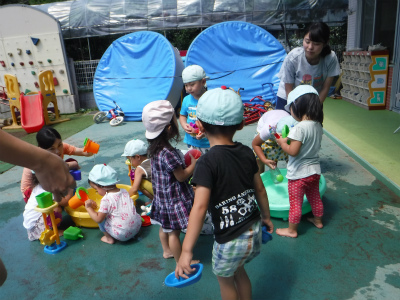 梅雨も明け、これから暑い日が続きそうですね! 熱中症には注意しましょう(^^)/ 今日はとても暑かったので全クラス園庭に出て 水遊びをしました!(^^)! バケツや大きなスプーン…