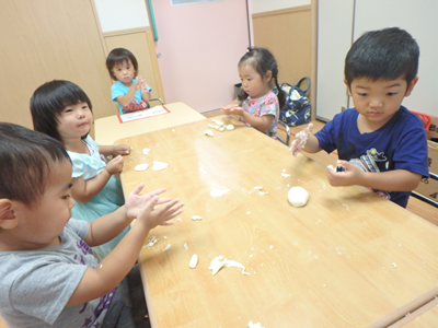 梅雨らしい一日、イルカ組さんは室内で 小麦粘土をしました。 「へび、にょろにょろ・・ホットケーキ♪」色々な物に 姿を変えていくようです!! 手先を上手に使っておだん…