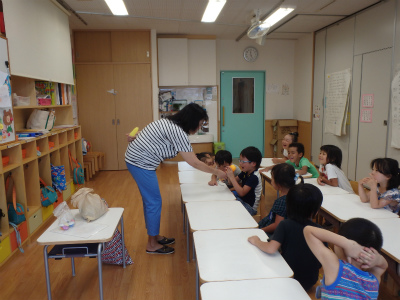イルカ組さんからライオン組さんは英語教室が ありました(^○^) 写真はライオン組さんです! 椅子に座り、きちんとお話を聞いています☆ 袋の中からフルーツや野菜が出てくると 「レモンだ」「ピー…